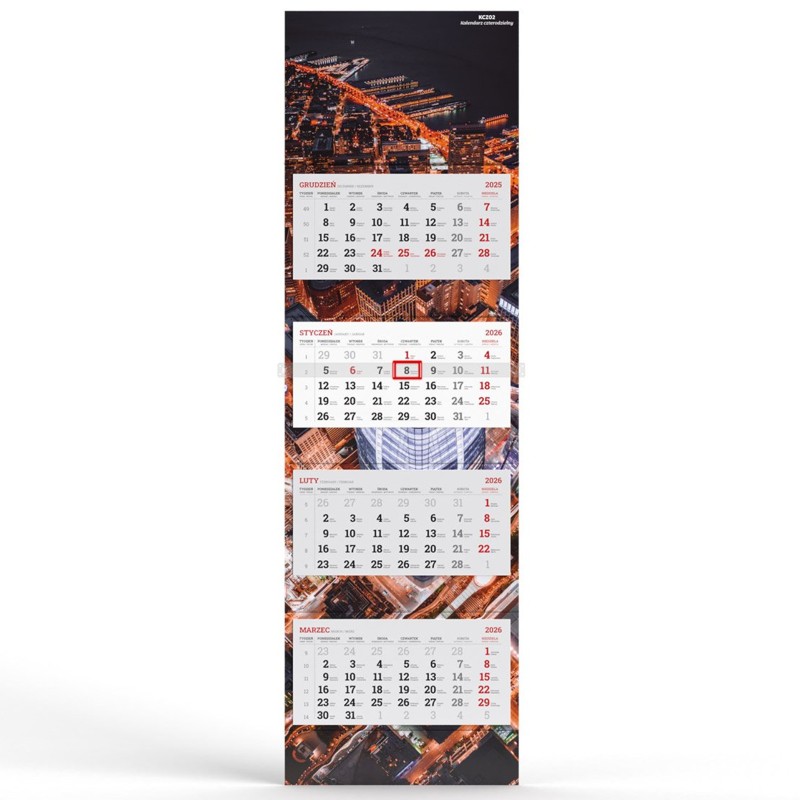 Wymiar kalendarza to 310 x 1026 mm . Jest to bardzo duża powierzchnia przeznaczona pod nadruk reklamowy.
