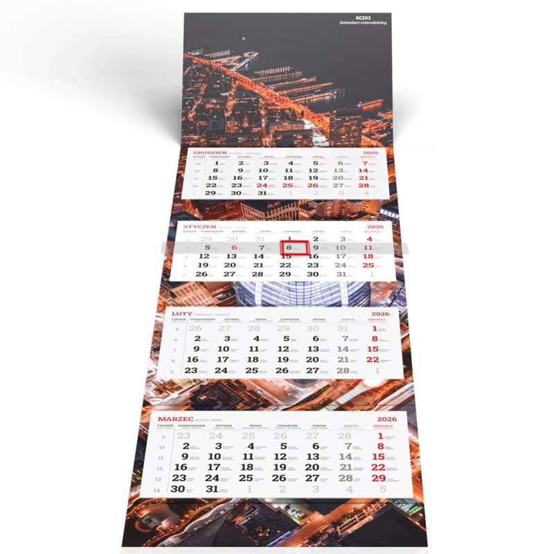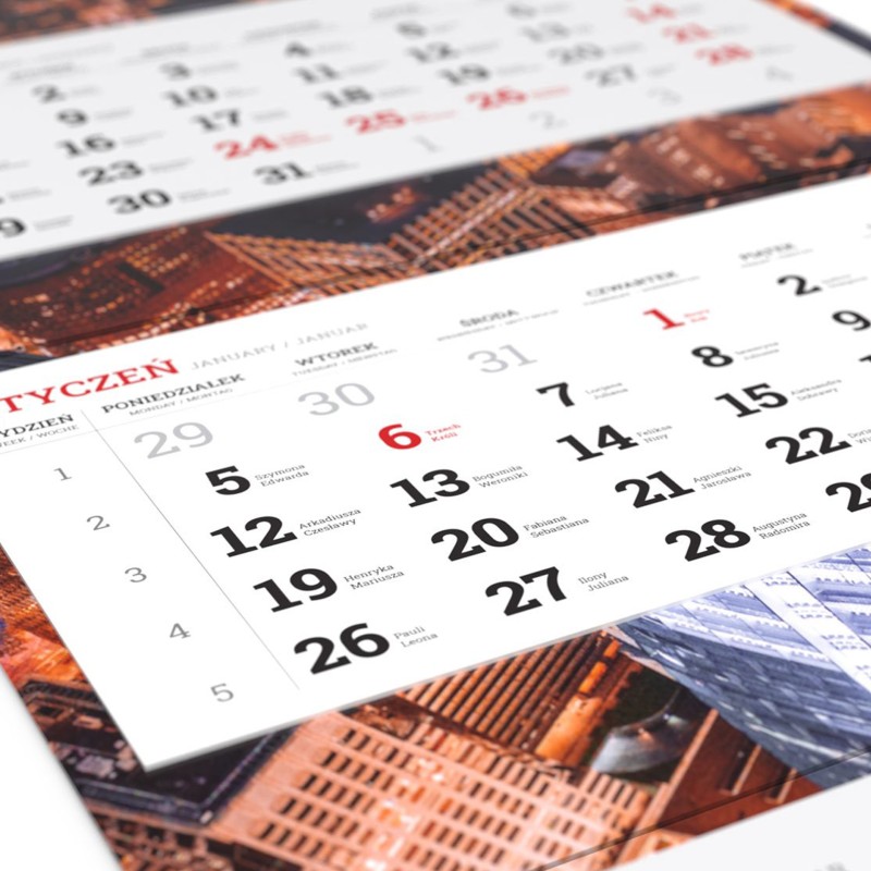 Kalendarz czterodzielny to duża powierzchnia przeznaczona na reklamę. Główka kalendarza ściennego, jak i plecki w całości przeznaczone są pod indywidualny zadruk w pełnym kolorze! Miejsce na reklamę to nie tylko główka, lecz także przestrzeń pomiędzy kalendariami oraz pod kalendariami, u dołu.