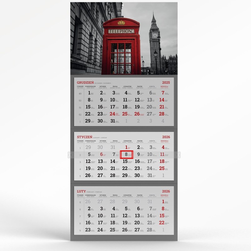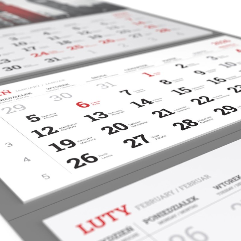 Kalendarz Standard to klasyczny kalendarz ścienny z trzema kalendariami i główką, na której można umieścić indywidualny projekt. Główka kalendarza zadrukowana jest w pełnym kolorze i dostępna w dwóch wersjach: płaskiej i wypukłej (kaszerowanej). Do główki doklejane są plecki w neutralnym szarym kolorze. Na pleckach standardowo umieszczone są 3 kalendaria - na obecny miesiąc, jak również poprzedni i następny, w kolorystyce czerwono - czarnej. Istnieje jednak możliwość personalizacji kalendariów - umieszczenia na nich dowolnego wzoru. Do kalendarzy możemy załączyć przydatne okienka do wskazywania aktualnej daty. Okienka dostępne są w 5 kolorach, dzięki czemu można je dobrać do kalendarza wg własnych preferencji.