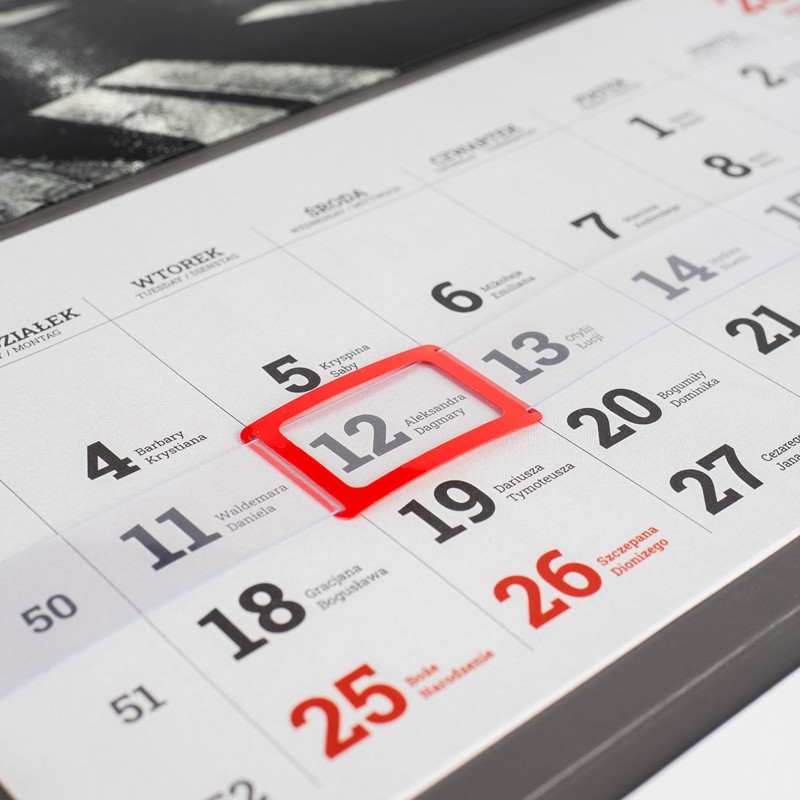 Standardowo w kolorze czerwonym. Jest możliwość zmiany koloru okienka na kolor: niebieski, pomarańczowy, zielony, żółty lub czarny. Każdy z tych kolorów posiada swoje unikalne cechy i może wpływać na odbiór estetyki kalendarza.
